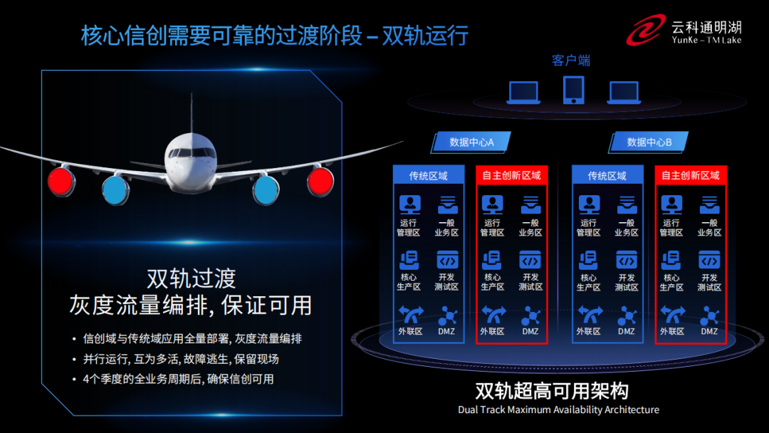 雙軌超高可用架構(gòu)在雙活數(shù)據(jù)中心的分區(qū)調(diào)度基礎(chǔ)上,增加信創(chuàng)域和非信創(chuàng)域的分域調(diào)度,實行信創(chuàng)域與傳統(tǒng)域應(yīng)用全量部署,使雙中心運營變?yōu)殡p中心四區(qū)域并行運行,互為多活,將傳統(tǒng)架構(gòu)變?yōu)榉謪^(qū)分域協(xié)同的多活雙軌超高可用架構(gòu)。幫助客戶在新架構(gòu)下,保障“信創(chuàng)”的同時解決性能瓶頸,提升穩(wěn)定性,保證應(yīng)用可持續(xù)性,最終實現(xiàn)信創(chuàng)區(qū)域和非信創(chuàng)區(qū)域的平滑過渡,完成國產(chǎn)化替代目標。