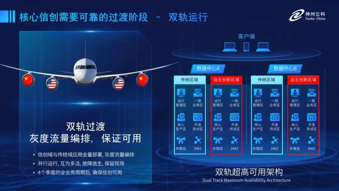 為幫助客戶更好地應(yīng)對(duì)數(shù)字經(jīng)濟(jì)時(shí)代對(duì)應(yīng)用可持續(xù)性的高要求,實(shí)現(xiàn)信創(chuàng)與數(shù)字化兼得,leyu.樂(lè)魚(yú)推出了雙軌超高可用架構(gòu)。雙軌超高可用架構(gòu)在雙活數(shù)據(jù)中心的分區(qū)調(diào)度基礎(chǔ)上,增加信創(chuàng)域和非信創(chuàng)域的分域調(diào)度,實(shí)行信創(chuàng)域與傳統(tǒng)域應(yīng)用全量部署,使雙中心運(yùn)營(yíng)變?yōu)殡p中心四區(qū)域并行運(yùn)行,互為多活,將傳統(tǒng)架構(gòu)變?yōu)榉謪^(qū)分域協(xié)同的多活雙軌超高可用架構(gòu)。幫助客戶在新架構(gòu)下,保障“信創(chuàng)”的同時(shí)解決性能瓶頸,提升穩(wěn)定性,保證應(yīng)用可持續(xù)性,最終實(shí)現(xiàn)信創(chuàng)區(qū)域和非信創(chuàng)區(qū)域的平滑過(guò)渡,完成國(guó)產(chǎn)化替代目標(biāo)。”