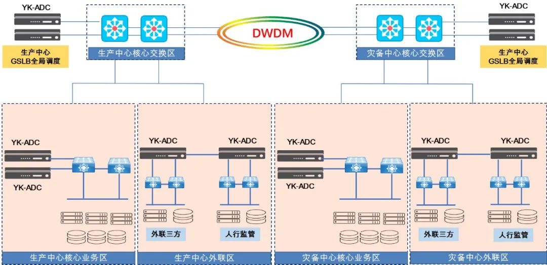 生產(chǎn)中心和災(zāi)備中心為對稱部署,兩個(gè)中心使用波分技術(shù)實(shí)現(xiàn)互相連接;